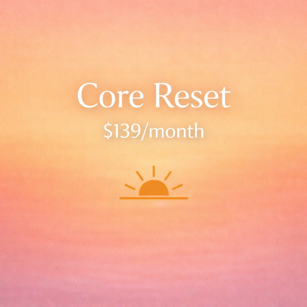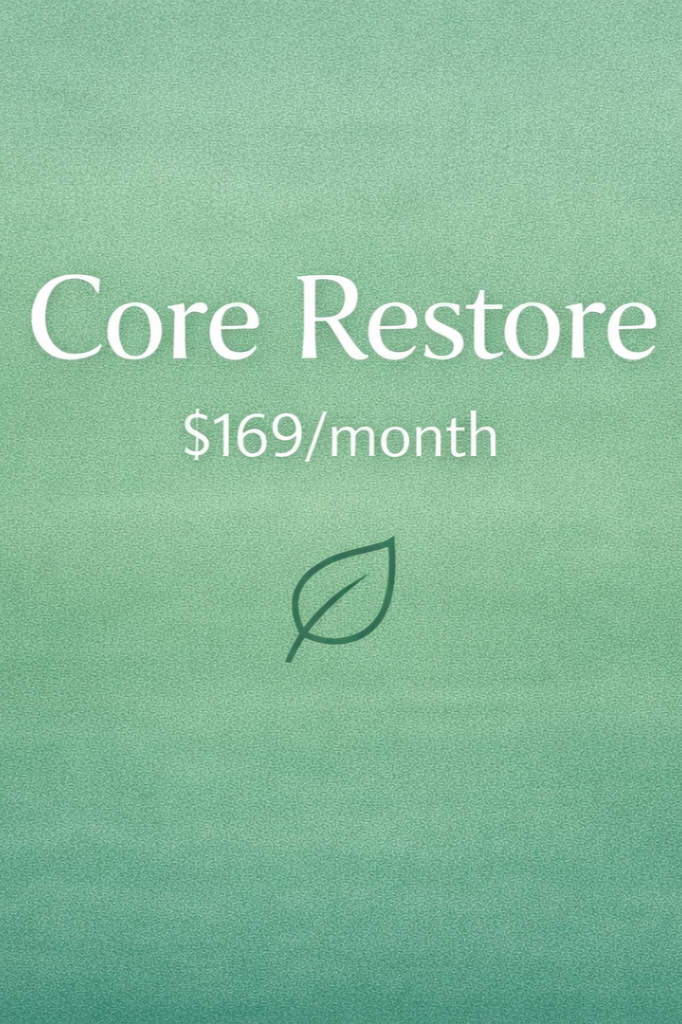 This is your “next level” plan when your system needs more than basic support. Core Restore adds detox services, skin + sinus comfort modalities, gentle nervous system support, and nurturing rituals that make it easier to stay consistent. It gives you more room to recharge without worrying about extra costs each time.